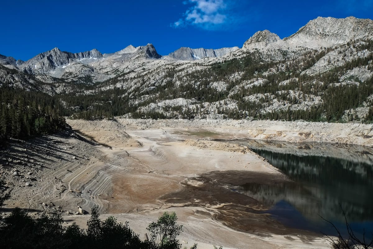 The Bishop Pass Trail leaves from the trailhead at South Lake and rises quickly to give you a view of this artificially dammed lake. Unfortunately, as of my trip in 2014, this is also a very visible sign of the drought we have been experiencing in California. The snow pack has not at all been close to normal, and this is reflected in the extremely low water level in South Lake.