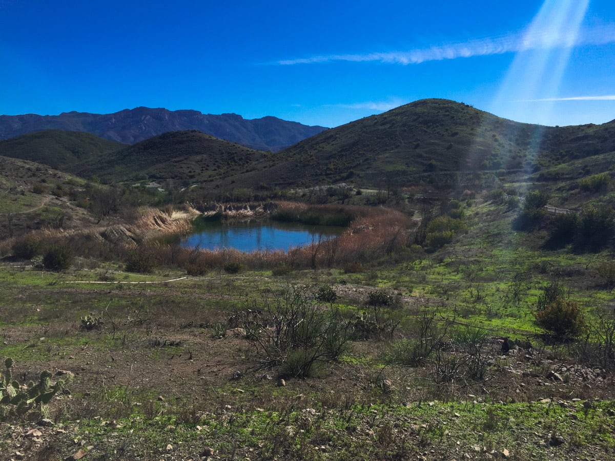 This trail will lead you up and away from the local neighborhood meander around the chaparral covered hill sides. About a mile in, there is a option to turn right and head up towards the large power lines with a great view of Camarillo, Oxnard, and all the way to Ventura on a clear day. Return the same way, but continue on your way toward the Twin Ponds. These scenic little ponds are closed off to swimming, but act as a refuge to animals that frequent the area. Continue past the ponds and head up hill to a view of the Pacific Ocean. If you are lucky on a clear day, a great view of Anacapa Island and the Santa Barbara Channel.
